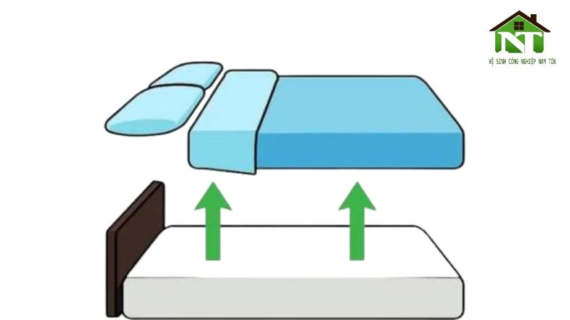 - Bước 1: Vệ sinh dọn dẹp khu vực giường, loại bỏ những đồ vật. Như là gối, chăn màn, đồ chơi,… Toàn bộ những đồ dùng có trên nệm.