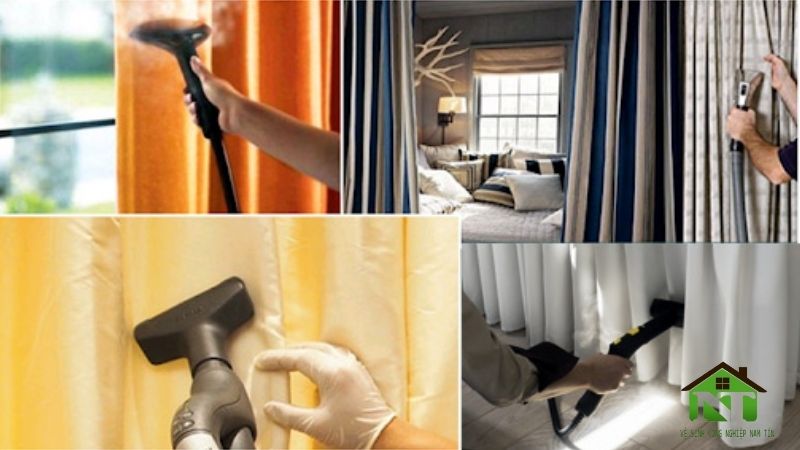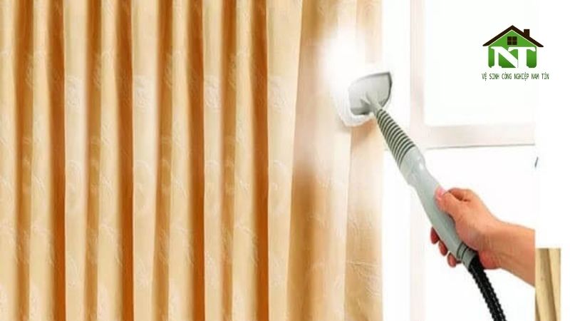 Phương pháp giặt bằng hơi nóng là một trong những cách hiệu quả để làm sạch rèm cửa. Nam Tín sử dụng