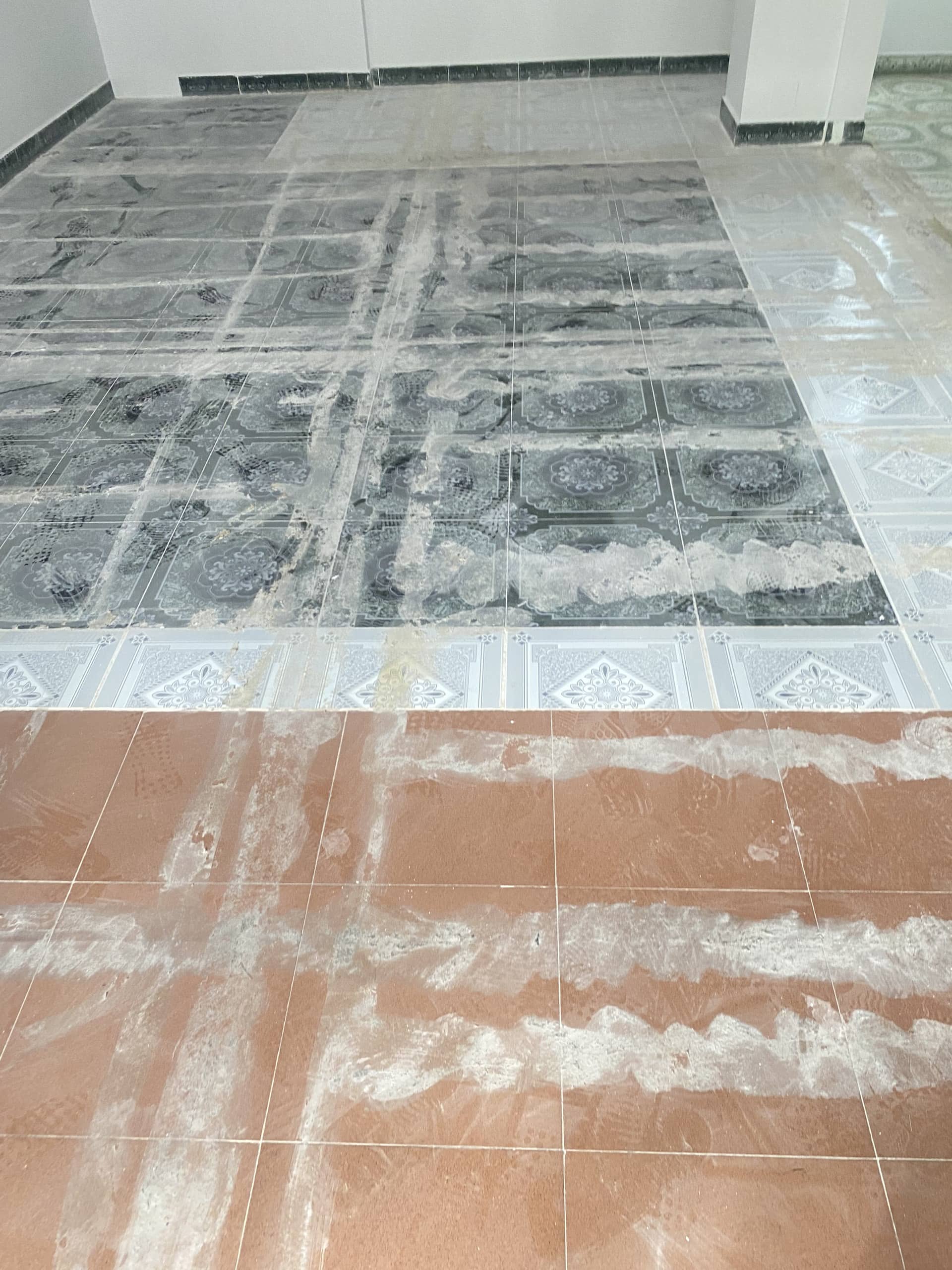 Tiến hành xử lý (lần 1) những vết bẩn lì như vết xi măng, vết sơn nước, sơn dầu,